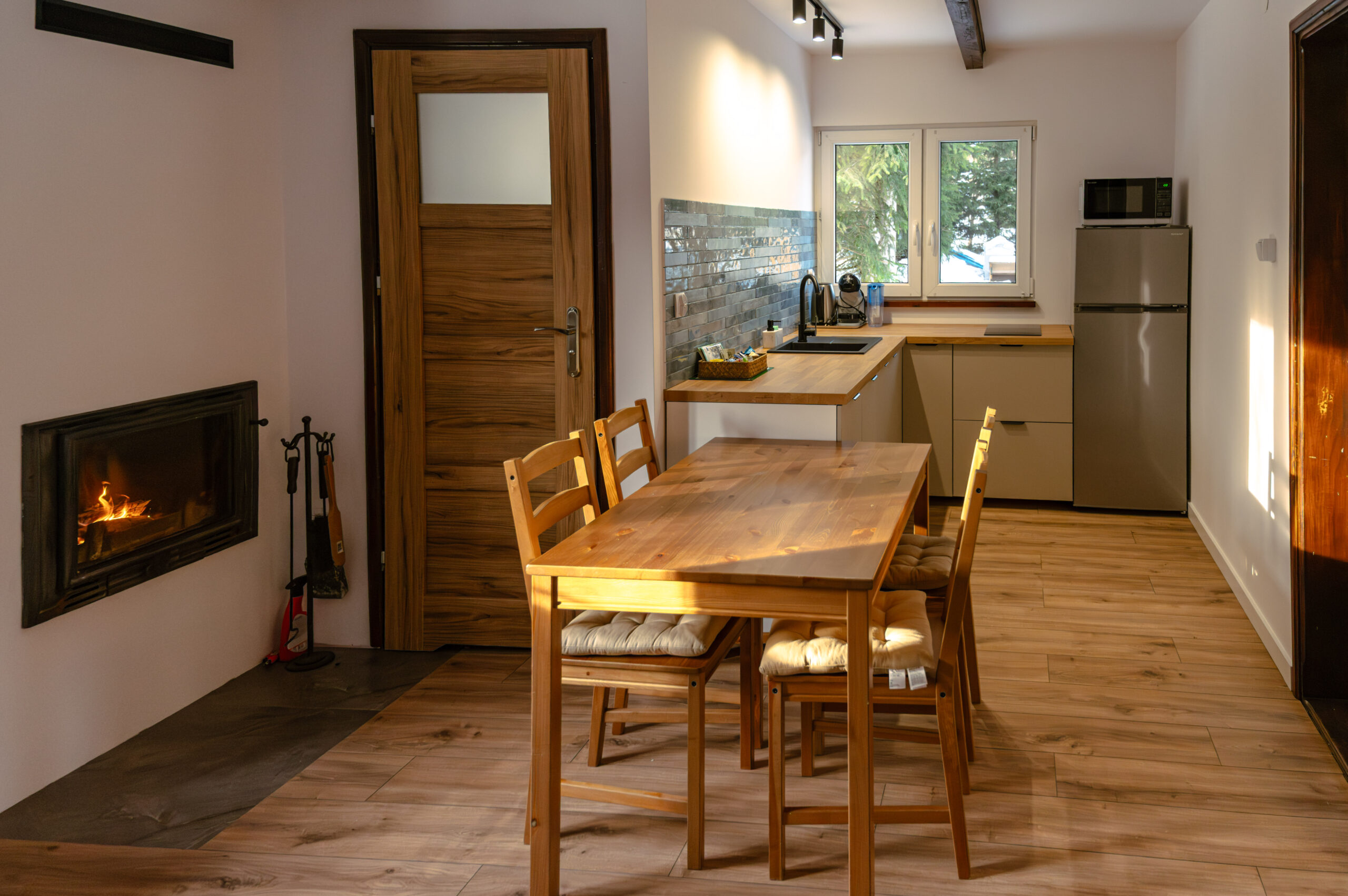 Wnętrze domku oferuje: aneks kuchenny z podstawowym wyposażeniem